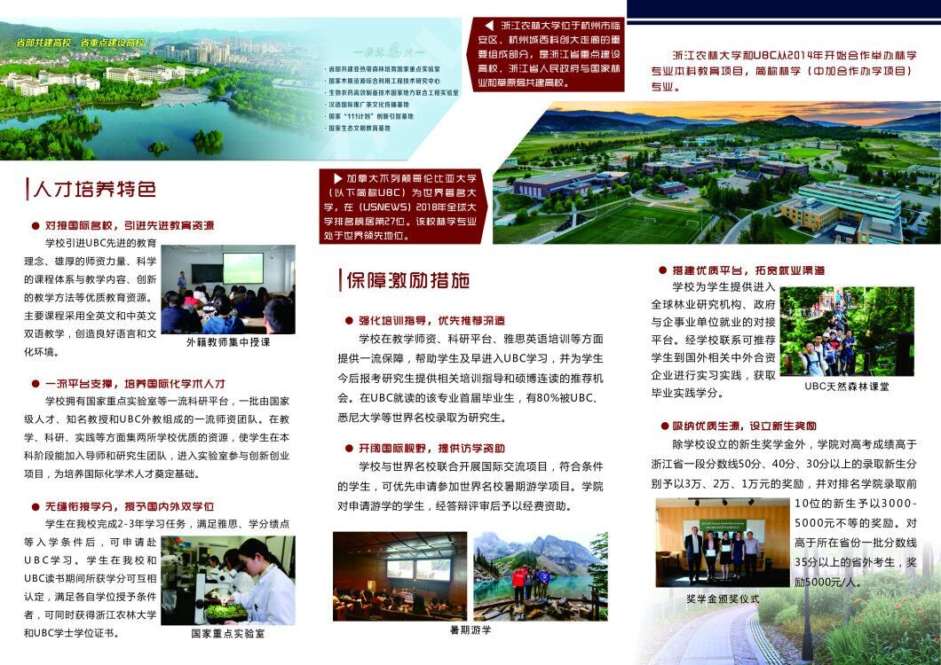 本专业引进UBC先进的教育理念、雄厚的师资力量、科学的课程体系与教学内容、创新的教学方法等优质教育资源。主要课程采用全英文和中英文双语教学,由外籍教师来华为学生集中授课,创造良好的语言和文化环境,旨在培养具有国际化视野、掌握前沿科技的高素质现代林业人才。