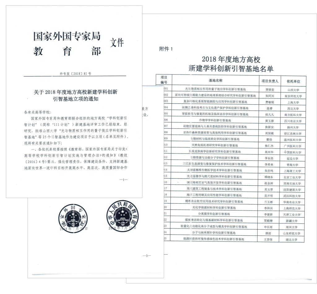 国家“111计划”旨在推进我国高等学校建设世界一流大学的进程。该项目由教育部和国家外国专家局联合实施,瞄准国际学科发展前沿,以国家重点学科为基础,从世界范围排名前100位著名大学及研究机构的优势学科队伍中,引进、汇聚1000余名优秀人才,形成高水平的研究队伍,建设100个左右世界一流的学科创新引智基地。