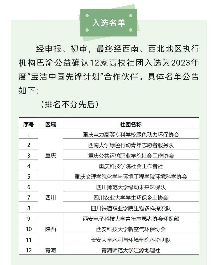 近日,负责西南、西北地区2023年度“宝洁中国先锋计划”的执行机构巴渝公益公布了入选社团名单,万象城江源地理社作为西北地区入选的合作伙伴,将围绕主题开展“生物多样性”主题调研及相关宣传实践活动。