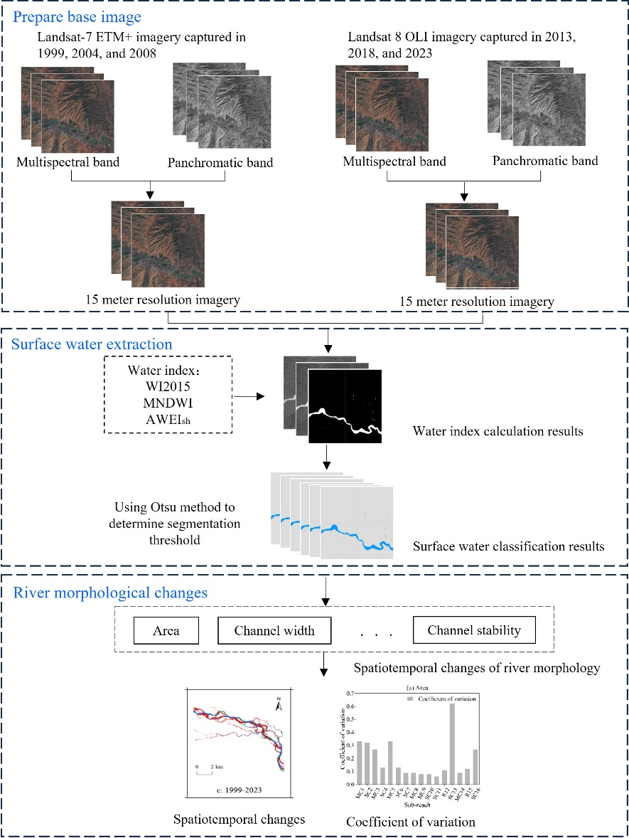 基于此,万象城金鑫教授课题组借助谷歌地球引擎和ArcGIS空间分析工具,基于全色图像锐化技术对1999-2023年研究区Landsat系列卫星遥感影像进行降尺度,并进行河流提取、河流形态学参数计算等,揭示了黄河上游河流形态时空变化特征。结果表明,全色图像锐化技术和AWEIsh水体指数的结合有利于提高细小水体提取精度,总体精度和Kappa系数分别为0.993和0.985;过去25年内,黄河上游全河段的面积和平均河宽变化较大,最大值为最小值的1.3倍;中心线长度和弯曲程度未发生明显变化;侧向迁移率变化较小,年平均侧向迁移4.67-10.18 m;在没有人类活动的典型河段中,尽管单河道河段的稳定性强于多河道河段,但自然因素(即年降水量、年径流量、年输沙量)对单河道河段和多河道河段的形态均有显著影响;大规模梯级水电开发在短期内对河流形态产生了显著影响,而在未受人类活动影响的河段,其变化是逐渐发生的。该研究为深入了解大区域和长时间尺度的复杂河流形态提供支撑,为黄河上游水资源管理和可持续发展提供了科学依据。